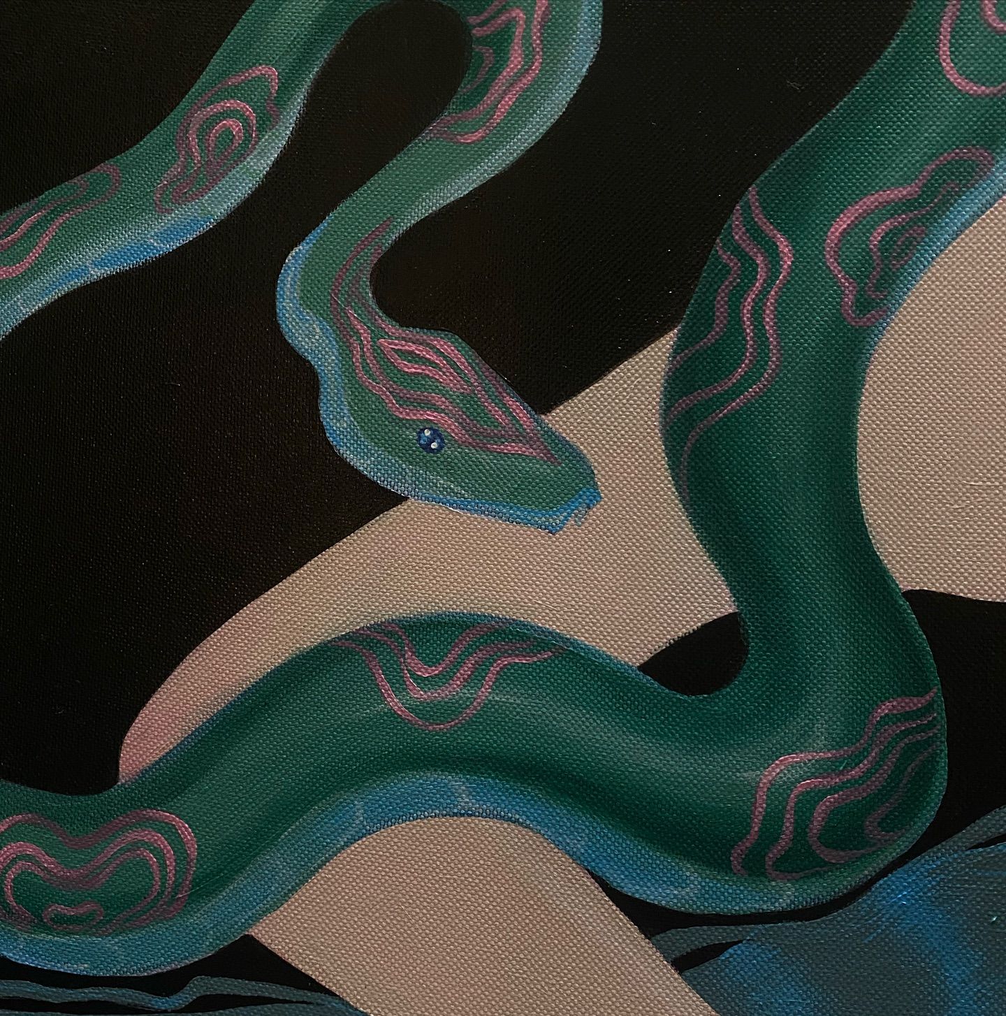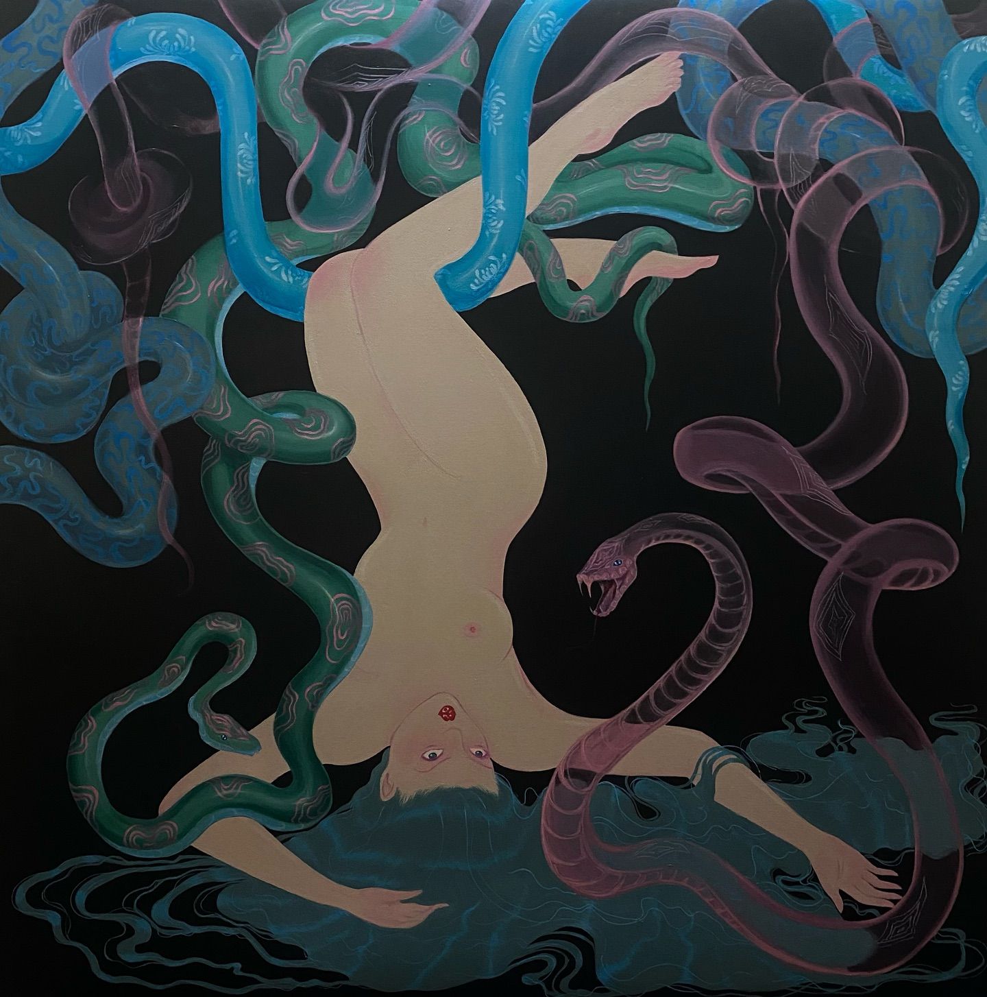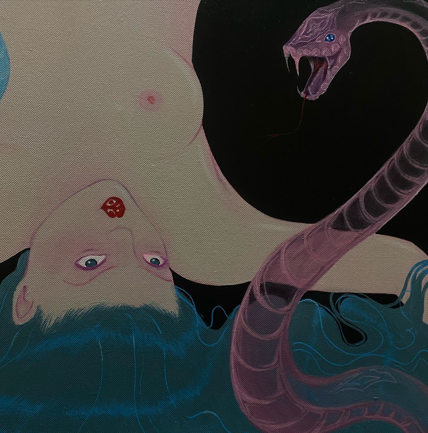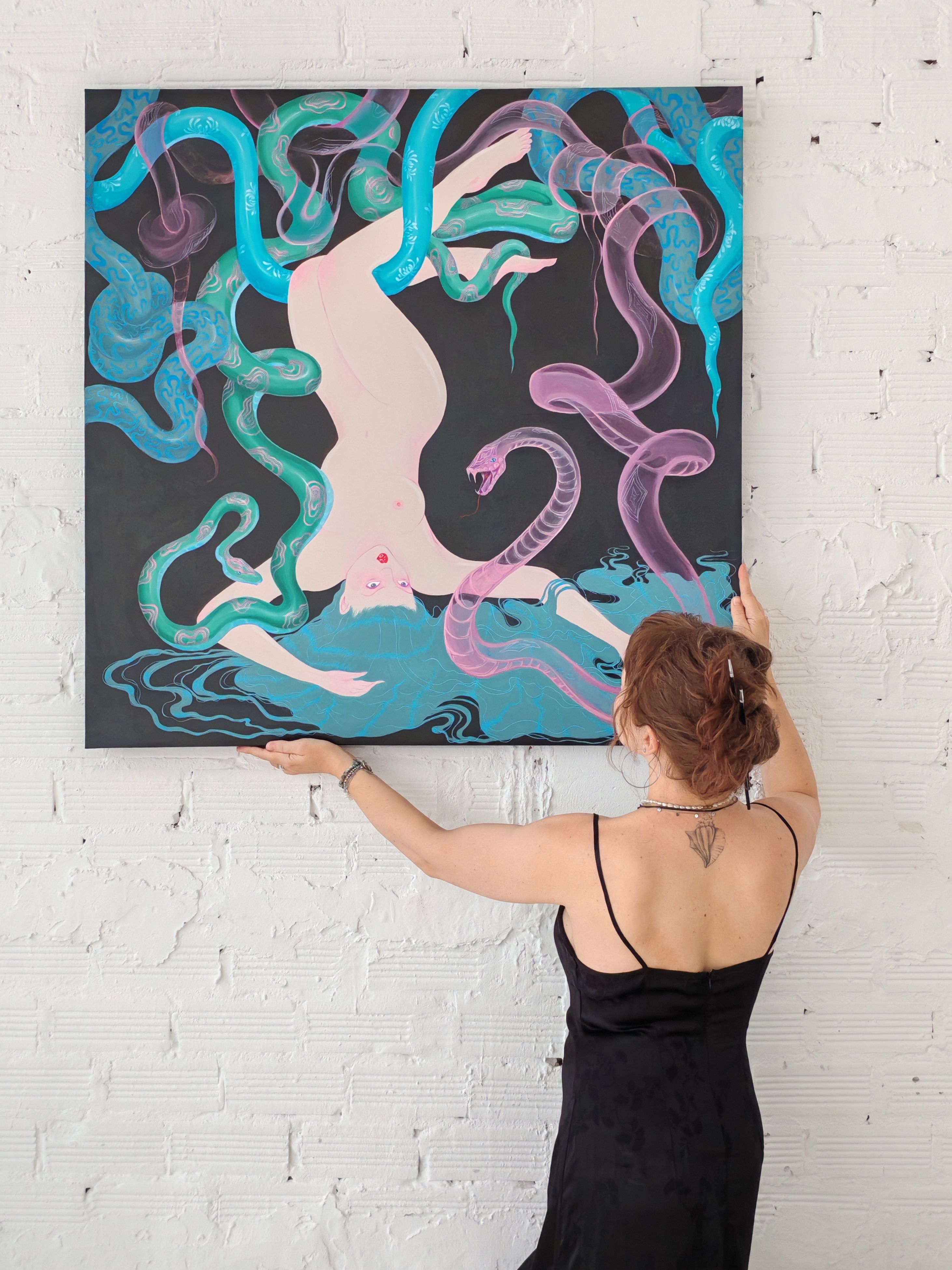 The painting plays with the tension between softness and danger, stillness and movement. Inspired by myth and the unconscious, it reflects on power, vulnerability, and the quiet pull of transformation.